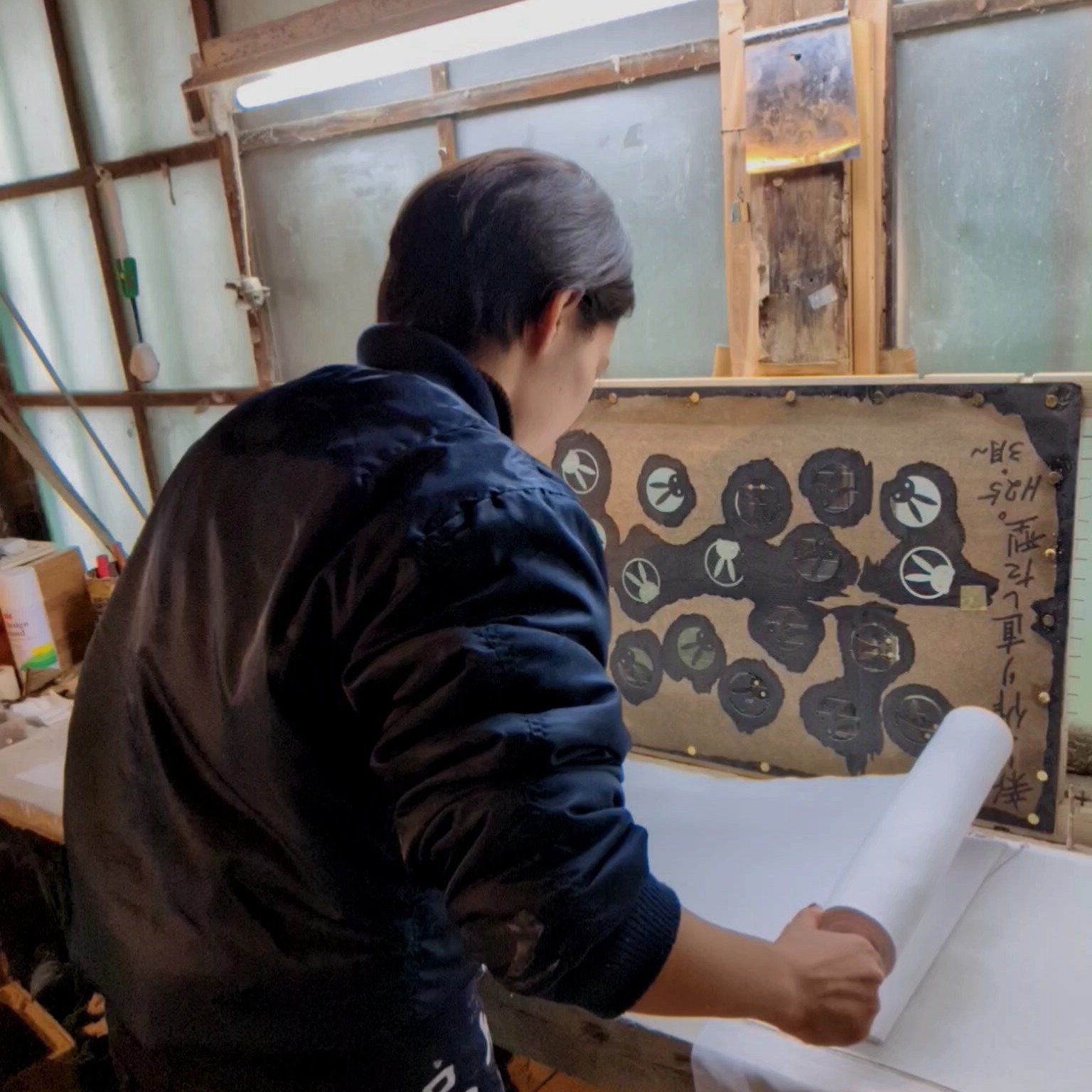 雪が降り続いている今週ですが、藤岡染工場では若い職人の糊置きの修行が始まりました