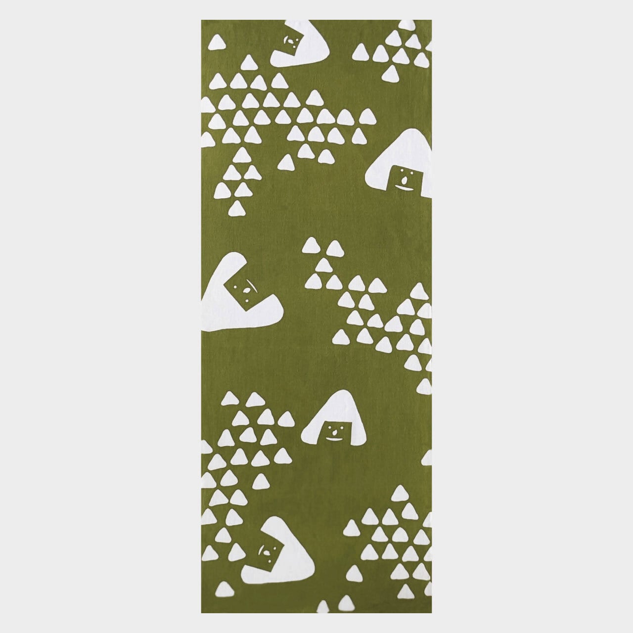 おにぎりの三角デザインと、おにぎりちゃんが可愛らしくデザインされた手ぬぐいです。